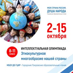 1) Интеллектуальная олимпиада «Этнокультурное многообразие нашей страны» для учащихся 8-11 классов проводится 02-15 октября 2023 г. дистанционно на сайте МБОУ ДО ГЦИР. Чтобы стать участником олимпиады, обучающемуся необходимо быть зарегистрированным на сайте МБОУ ДО ГЦИР на программу «Духовно-нравственные традиции России» (8-11 класс). Олимпиаду составляют 100 вопросов . Задания олимпиады выполняются участником последовательно путём выбора правильного ответа из предложенных четырех. На выполнение олимпиады отводится 40 минут. Участнику дается одна попытка.