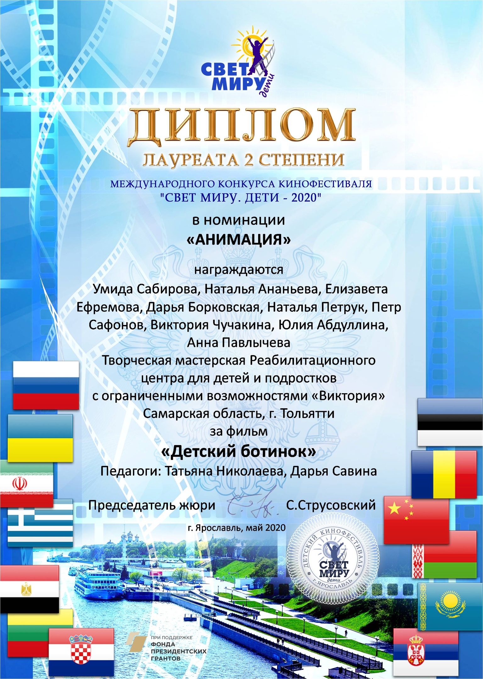 Городской фестиваль «Зазеркалье»: 2 место в номинации «Анимационный фильм». Диплом Международный конкурс-фестиваль "Свет миру. Дети-2020": диплом лауреата 2 степени в номинации "Анимация". Диплом Большой Всероссийский фестиваль детского и юношеского творчества, региональный этап конкурса кинофототворчества «Волшебный луч»: диплом лауреата 3 степени в номинации "Анимация". Диплом Областной фестиваль детских социально-ориентированных фильмов "Твой взгляд": диплом лауреата 2 степени в номинации "Анимация". Специальный диплом "За увековечивание памяти малолетних узников концлагерей" |