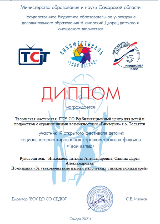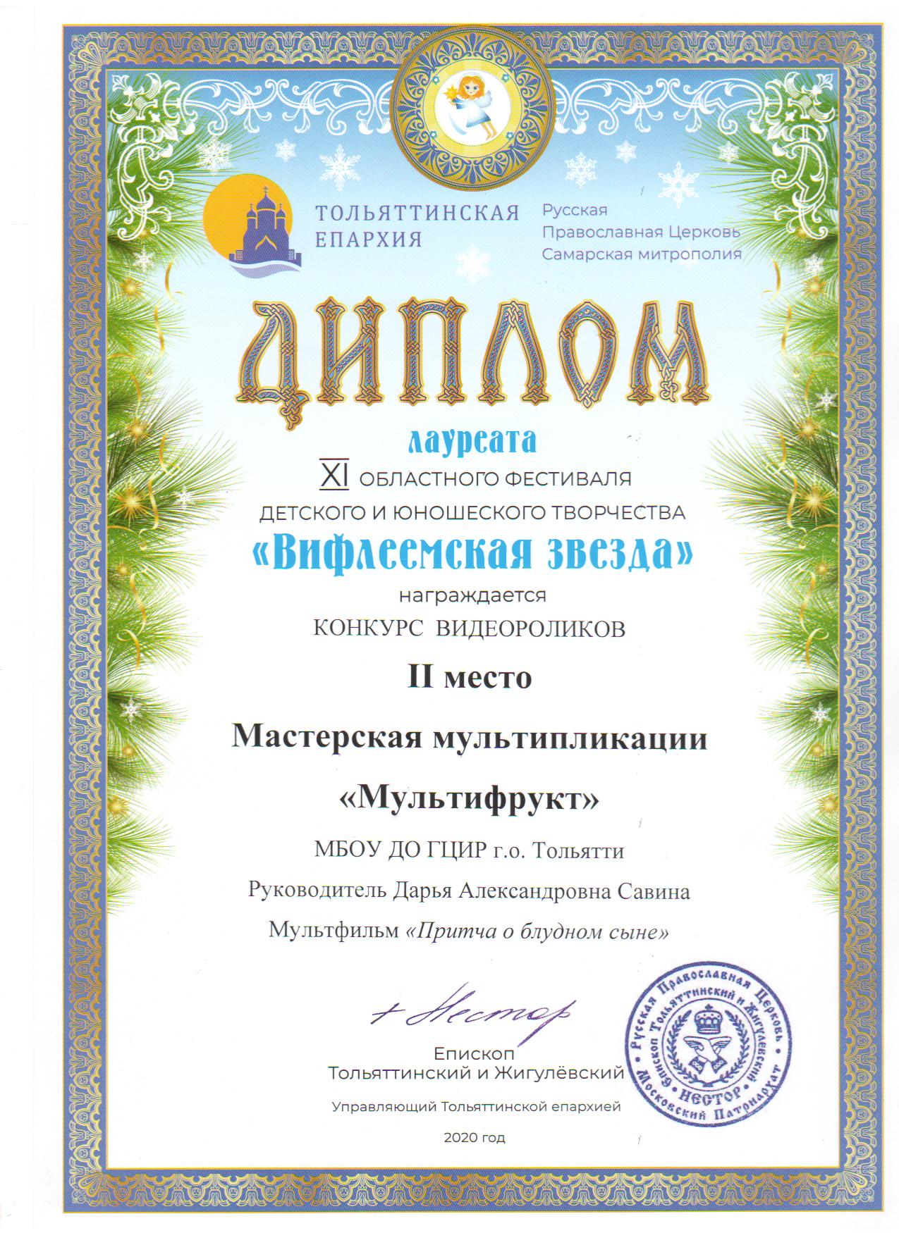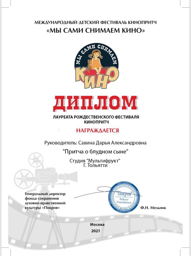 Областной XI фестиваль детского и юношеского творчества «Вифлеемская звезда»: 2 место. Международный детский фестиваль кинопритч "Мы сами снимаем кино": диплом лауреата. Областной фестиваль детских социально-ориентированных фильмов "Твой взгляд": диплом лауреата 1 степени |